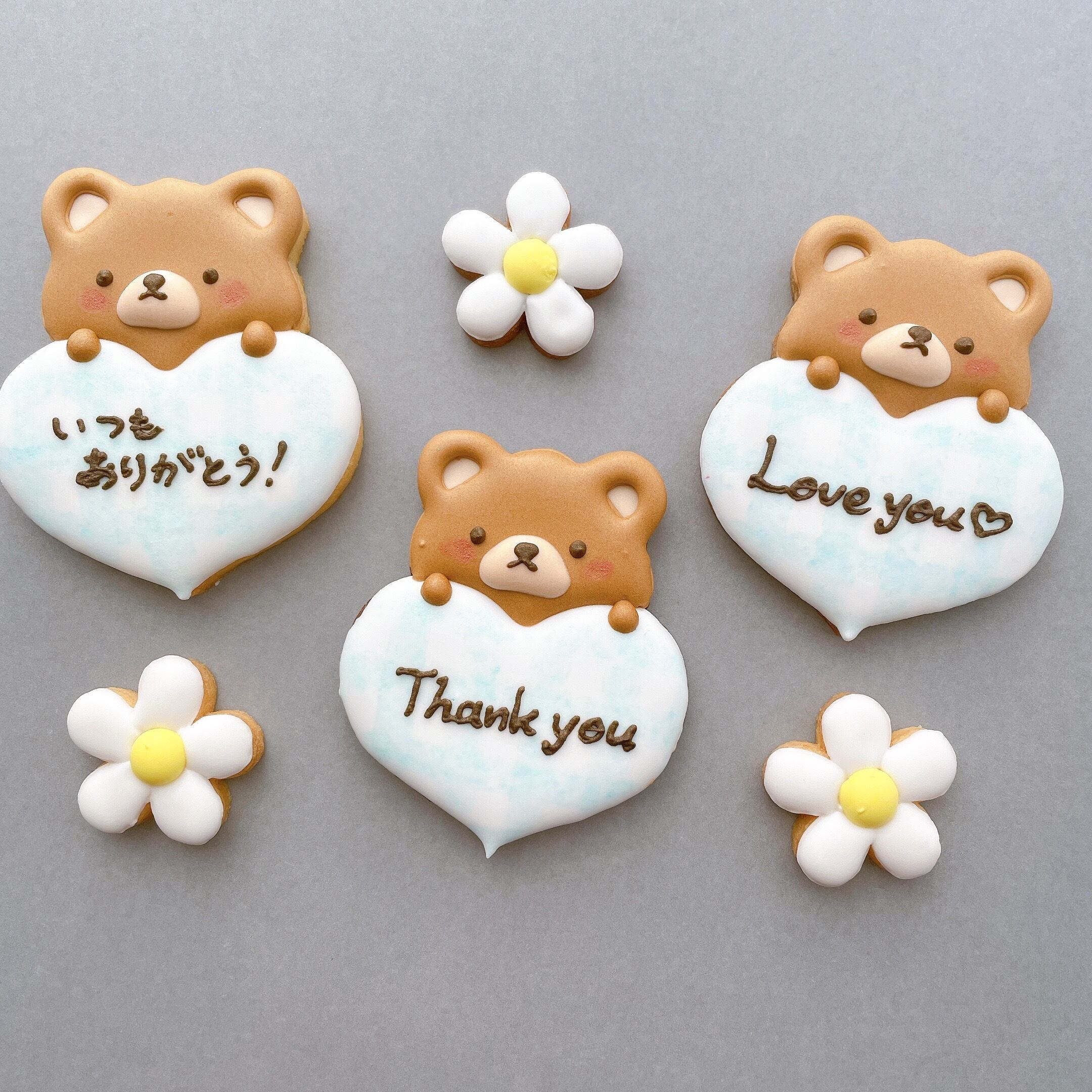 頬を赤らめながら気持ちを伝えるくまとミニフラワーのアイシングクッキーです。